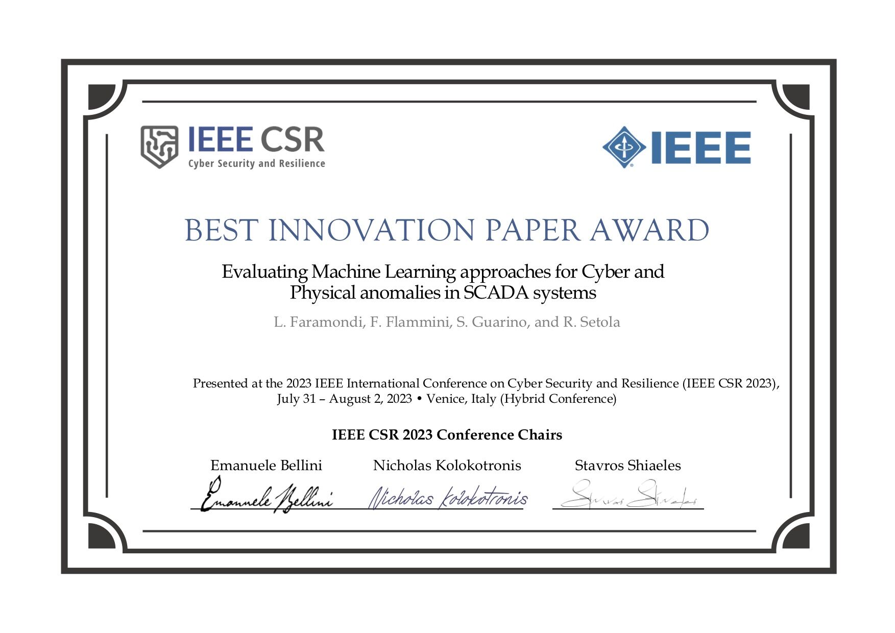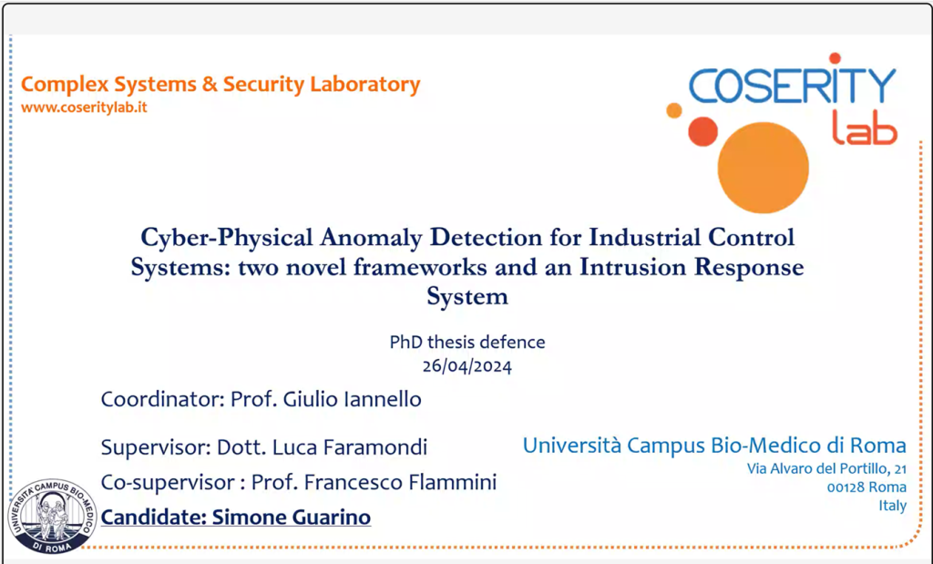 Today Simone Guarino, TAS group affiliated member, has presented his research on cyber-physical anomaly detection for industrial control systems. The ensemble detection models he used are based on a combination of unsupervised machine learning and dynamic Bayesian networks, which he developed during his visit at IDSIA, hosted and supervised by Prof. Francesco Flammini. The main results of his research led to impactful publications on top international journals, such as IEEE Access, Computers and Electrical Engineeting (Elsevier), and IEEE Transactions on Industrial Cyber-Physical Systems, as well as to a Best Innovation Paper Award at IEEE CSR conference last year.